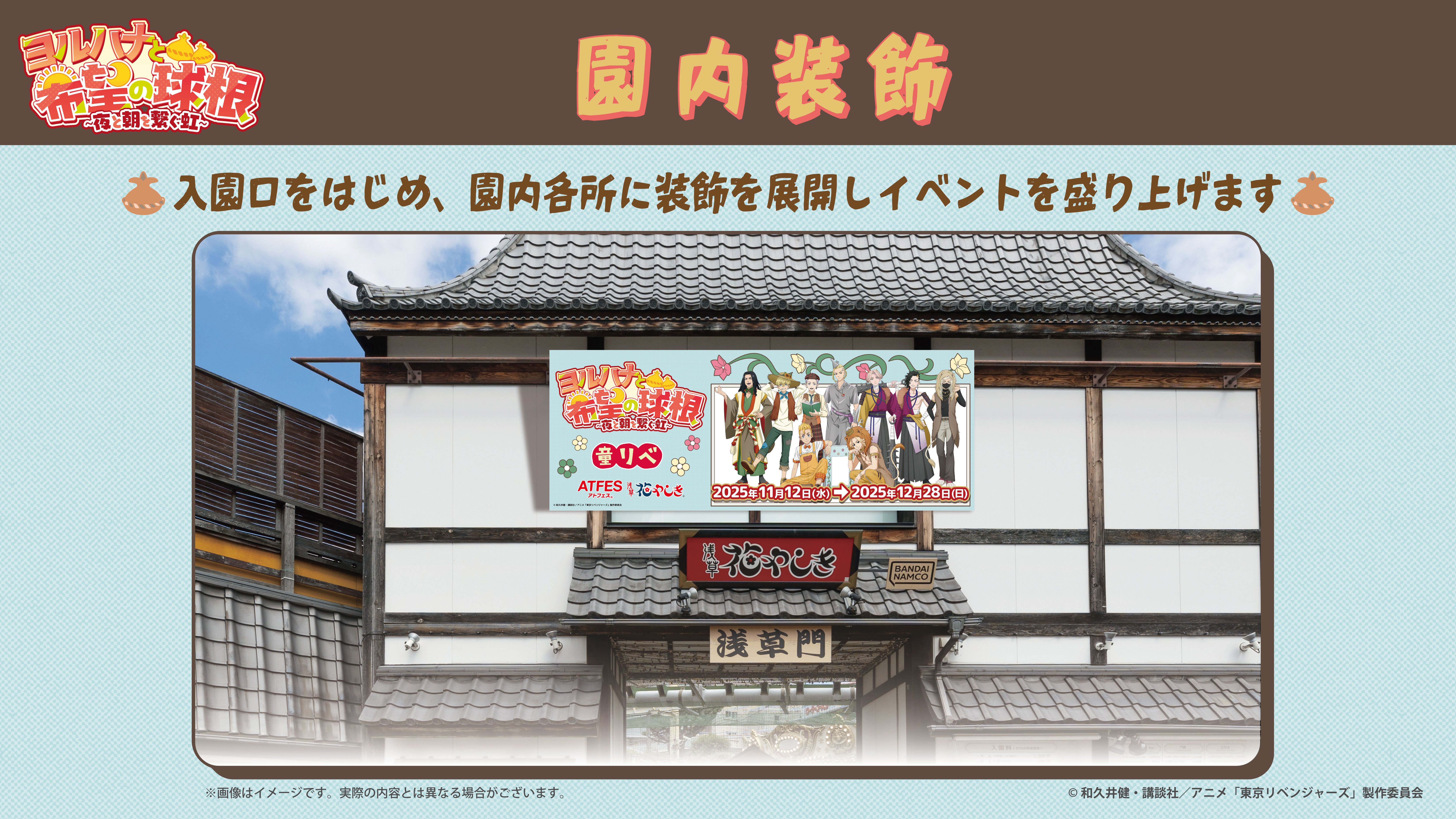 園内各所に今回のコラボにちなんだ装飾を展開します。描き下ろしイラストのキャラクターパネルなどを掲示しますので、園内散策をお楽しみください。
